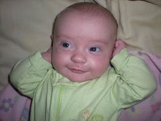 It's scary to me that she can already look this mischievous.Tomorrow Olivia is 4 months old. It suddenly seems to be going so fast! Today she had her 4 month check up. The doctor started talking about introducing rice cereal and solid foods and I thought, "Why is he telling us this?" And then suddenly I realized, "Because before her next appointment she is actually going to be eating sometimes instead of just drinking! Holy cow!"