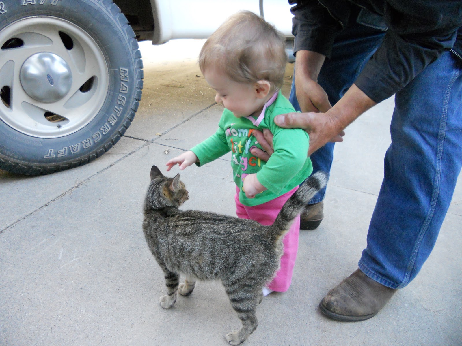 We had fun hanging out with my parents and Olivia went down for bed late, but really well. The next day we had church, then lunch and more time at the farm. The weather was just perfect! Olivia got to swing outside and we took a few pictures of our family. We got to check out the pumpkins my mom planted - apparently she CAN grow something other than beets! Olivia then went down for a nap while I went for a ride with Papa Mark. I got some nice pictures of the river and of the ponds down the hill. After I got back we all hung out some more before it was time to leave. Olivia even got to pet a kitty, which she loved. Anything furry is A-OK with this kid.