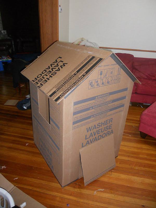For Olivia's second birthday I fell in love with the idea of making her a little playhouse out of cardboard. I was inspired by one that I saw here, but I didn't care for the flat roof and I didn't want to deal with buying more paint to make a bunch of cardboard flowers for the window box. So here are the pictures of what Glenn and I came up with together. We had a lot of fun doing it together and we spent less than $9 total! One trick that my brilliant husband came up with was to use the edge of the second box to make the roof. It looks much cleaner that way. We used duct tape to hold the house together and then a glue gun to put on accessories.